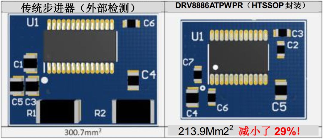 最后,由于步进电机传统上需要两个外部感应电阻器才能将电流反馈给驱动器,因此我们可以改进步进电机,使之更好地受益于集成电流感应的PCB尺寸和BOM优势。图4比较了传统驱动器PCB占用空间和从内部电流感应中受益的DRV8886AT。