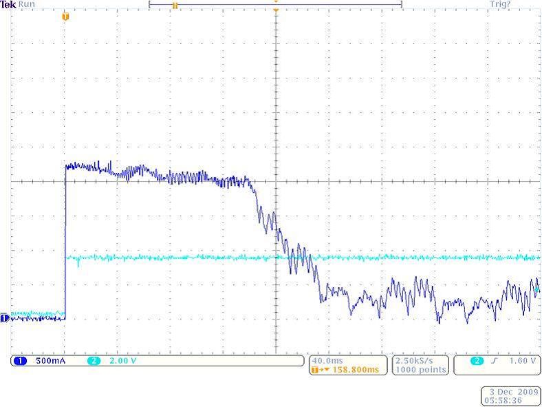 图1是电流与时间的关系图,显示了刷式直流电机的启动曲线。在此例中,在电机达到小于1安培的稳态条件前,电流被限定为约2安培。如果没有电流调节,同样的电机峰值可以达到14安培以上。因此不仅需要过度设计的电源来支持这一瞬态,还需要对电机驱动器进行额定以可靠地处理峰值电流。